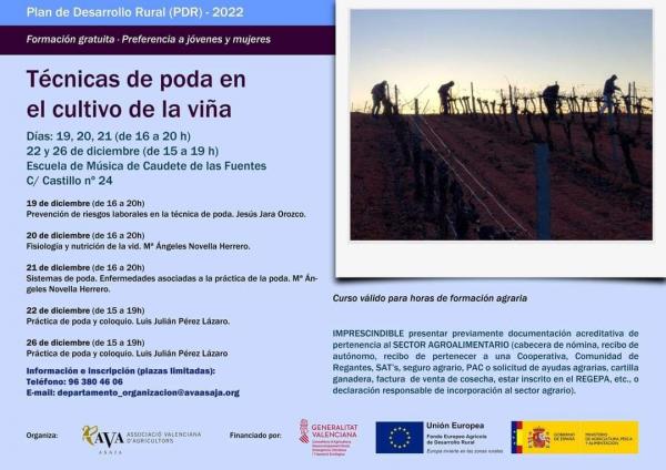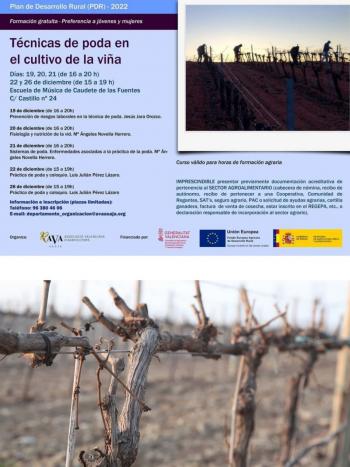 La formación a las técnicas de poda en el cultivo de la viña tendrá lugar los días 19, 20, 21 (de 16 a 20h) y los días 22 y 26 de diciembre (de 15 a 19 h) en la Escuela de Música de Caudete de las Fuentes (Calle Castillo nº 24).