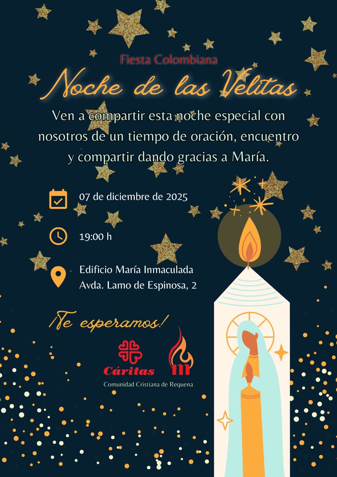 La llegada del mes de diciembre es para Cáritas de Requena un mes lleno de eventos que culminan el día 24 de diciembre en que conmemoramos los católicos el nacimiento del niño Dios. Iniciamos con la celebración de la FIESTA DE LAS VELISTAS. Actualmente nuestra comunidad la forman personas de muy distintos orígenes y en una gran mayoría de ciudadanos colombianos, es tradición en este país celebrar la tarde noche del 7 de diciembre la FIESTA DE LAS VELITAS, es para ellos una fiesta de un marcado carácter religioso y cultural. Representa para ellos el inicio de las festividades navideñas y tiene su origen en la celebración de la Inmaculada Concepción de la Virgen María. Por ello ya por tercer año convocamos tanto a la población colombiana como a la población de Requena en general el próximo día 7 de diciembre a las 19:00 horas en la sede de Cáritas, junto a la capilla de María Inmaculada para conmemorar esta fiesta que se iniciará con una oración en la capilla, encendido de velitas y a continuación degustación de repostería tradicional colombiana y local, ambientada con música tradicional colombiana.