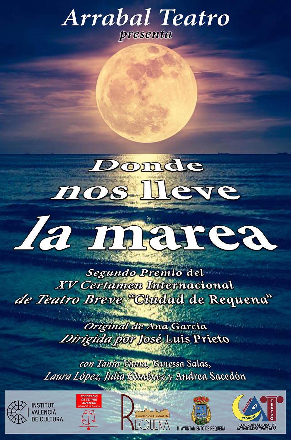 El próximo domingo, día 9 de octubre y a las 19:00 horas finalizará la presente edición del Festival con la puesta en escena de un montaje de ARRABAL-TEATRO, se trata de “Donde nos lleve la marea” de Ana García, cuyo texto mereció el segundo premio del XV CERTAMEN INTERNACIONAL DE TEATRO BREVE “CIUDAD DE REQUENA” y que el veterano grupo teatral requenense ya preestreno, el pasado mes de septiembre, en el Teatro García Berlanga de San Antonio, cuya puesta en escena, aspectos técnicos y calidad actoral fue muy elogiado por el público asistente. Bajo la dirección de José Luis Prieto, cinco actrices: Vicen Pérez Sierra, Vanessa Salas, Laura López, Julia Giménez y Fatma Hossein, dan vida a las protagonistas de la obra que nos conducen a diferentes tiempos y a distintas geografías, pero que todas nos muestran una necesidad de sobrevivir, de sobreponerse a las realidades que les rodean a cada una de ellas y superar, con determinación, las adversidades.