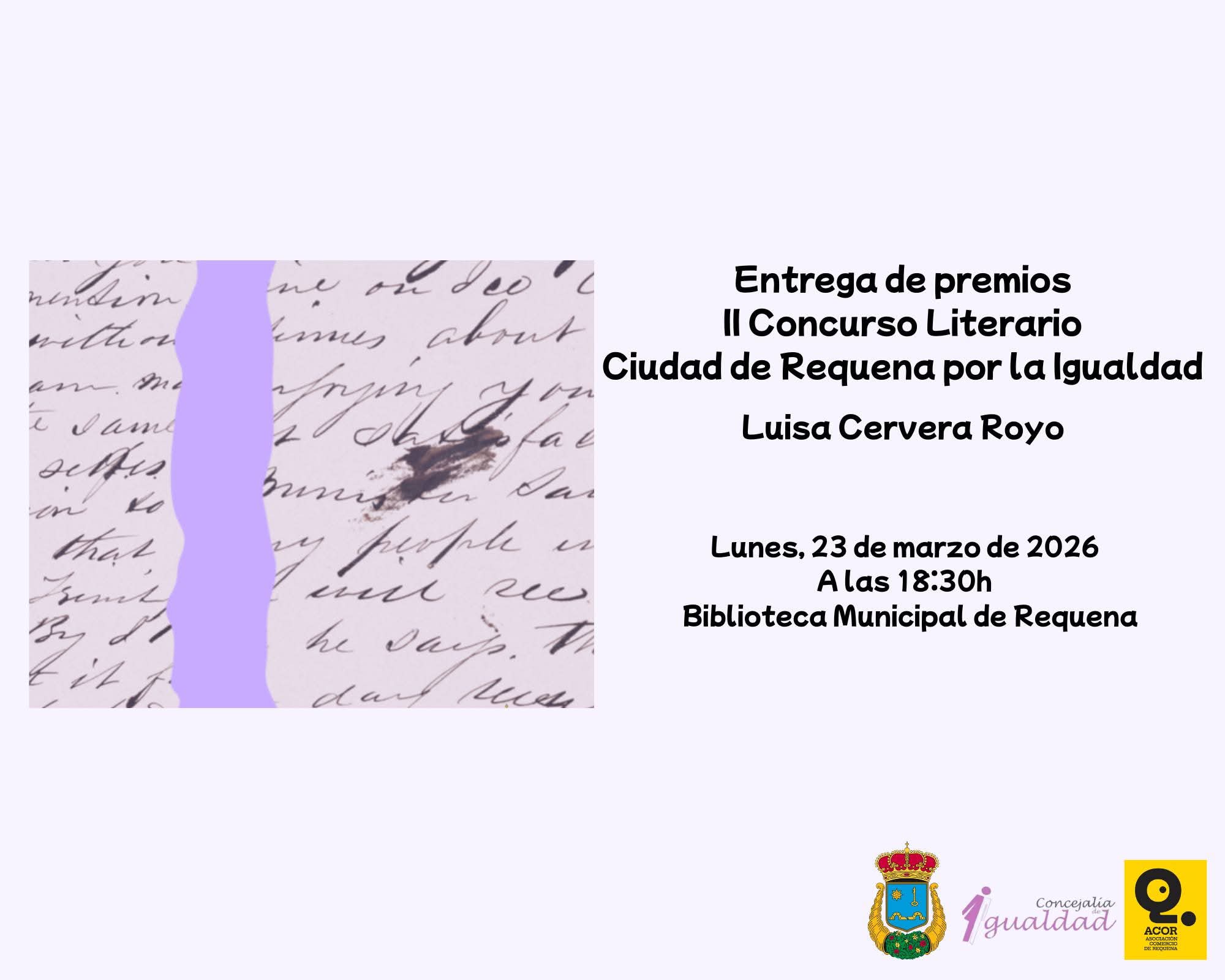 Desde el Ayuntamiento de Requena informan de que el próximo lunes, 23 de marzo, a las 18:30h, tendrá lugar la entrega de premios del II Concurso Literario Ciudad de Requena por la Igualdad “Luisa Cervera Royo”, en la Biblioteca Municipal de Requena.