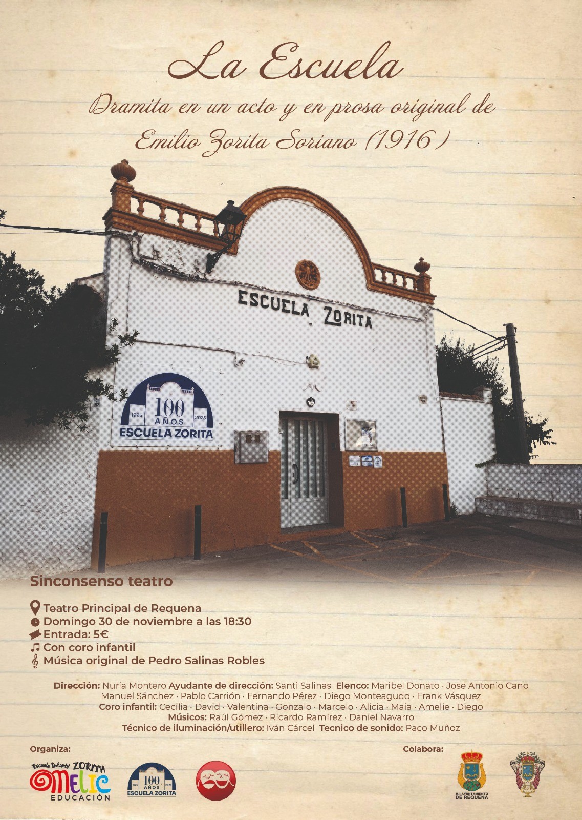 El próximo domingo, 30 de noviembre, a las 18.30 h. tendrá lugar la representación de «La Escuela» Dramita en un acto, a cargo de Sinconsenso Teatro. Esta obra de teatro fue escrita por Emilio Zorita Soriano en 1916 y representada en ese mismo año en Morella por el grupo «Juventudes Morellanas».