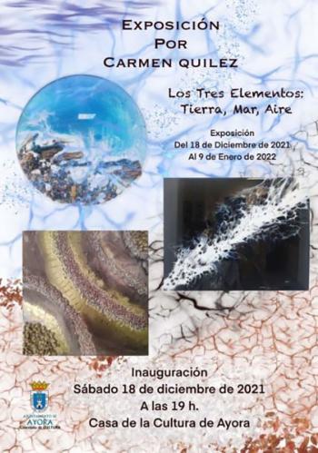 A partir del próximo sábado, 18 de diciembre, se ubicará, en la Casa de la Cultura de Ayora, la exposición “Los tres elementos: Tierra, Mar y Aire” de Carmen Quílez.
