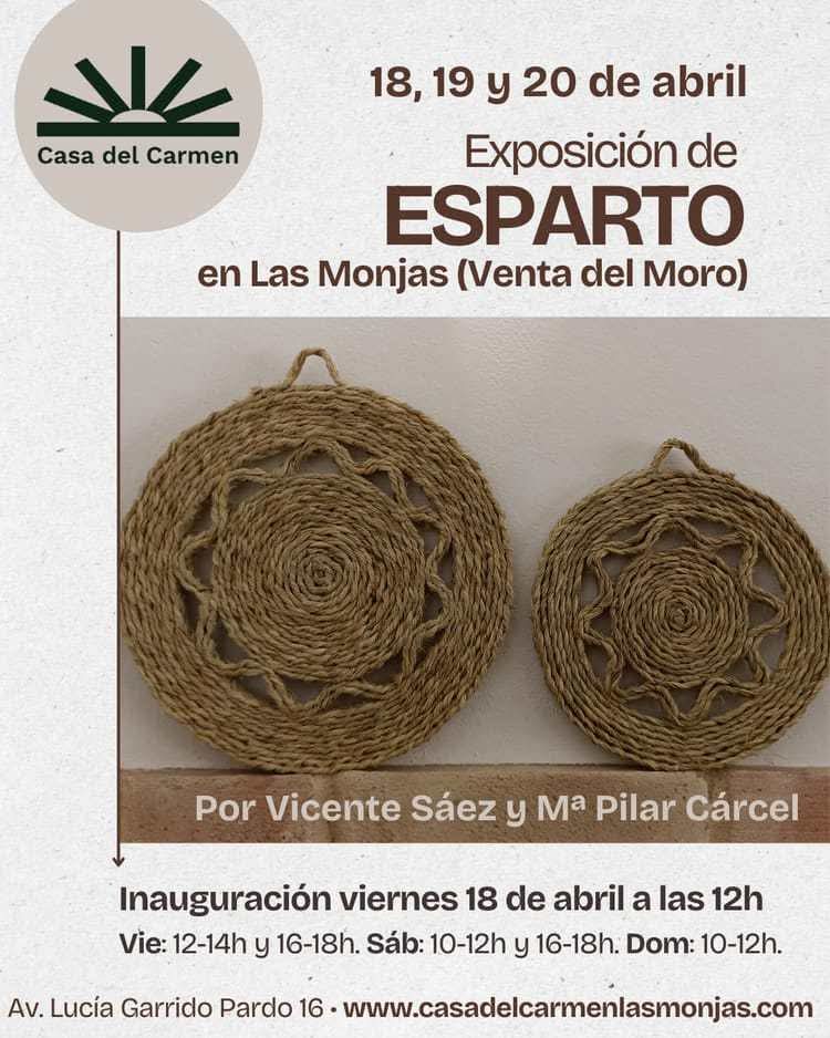 La pedanía venturreña de Las Monjas acogerá, del 18 al 20 de abril, una exposición de artesanía de esparto de Vicente Sáez y M.ª Pilar Cárcel.
