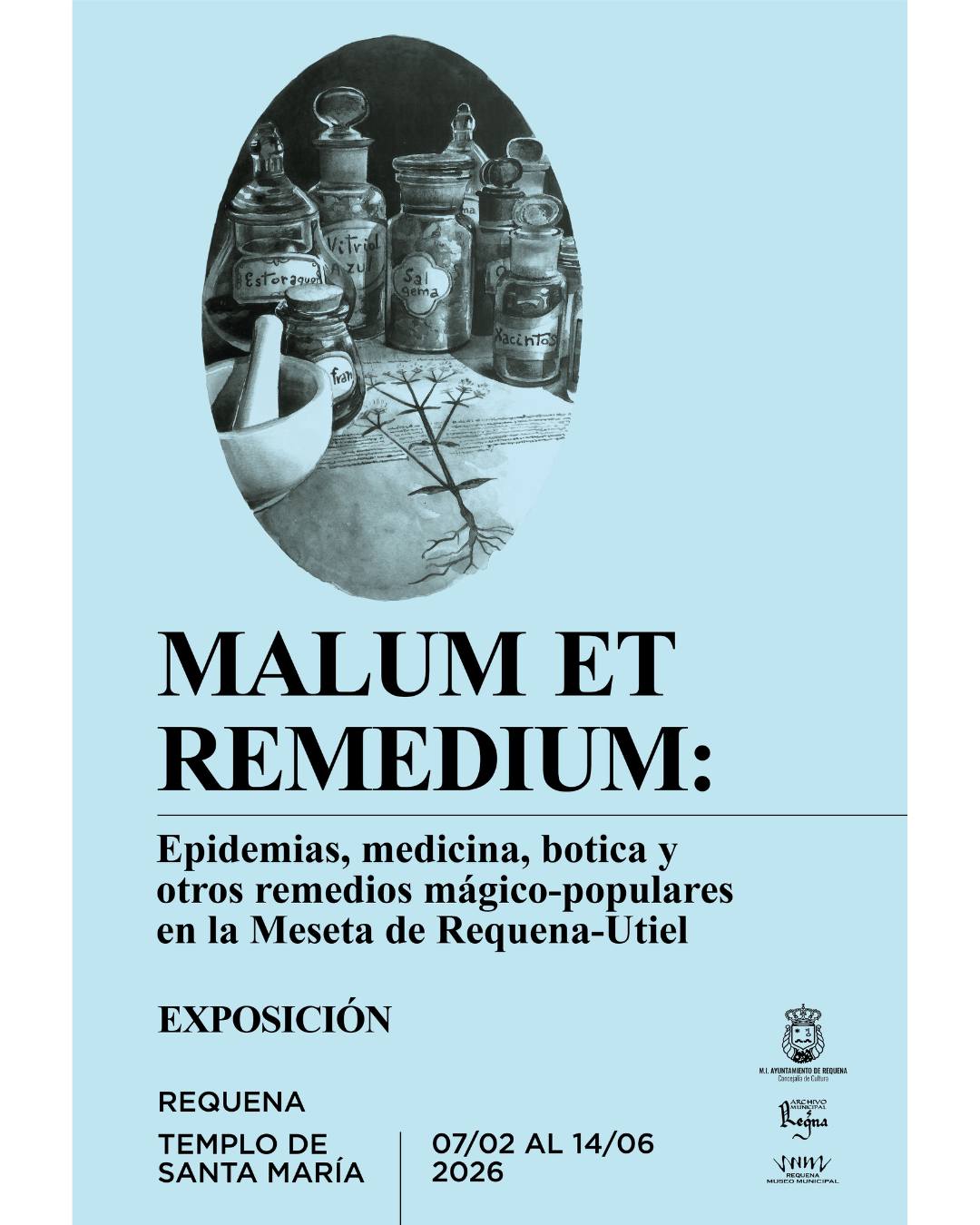 El próximo sábado 7 de febrero, a las 12:00 horas, se inaugurará en el Templo de Santa María la exposición “Malum et remedium: epidemias, medicina, botica y otros remedios mágico-populares en la Meseta de Requena-Utiel”, una muestra de gran valor histórico y cultural producida por la Concejalía de Cultura del M.I. Ayuntamiento de Requena.