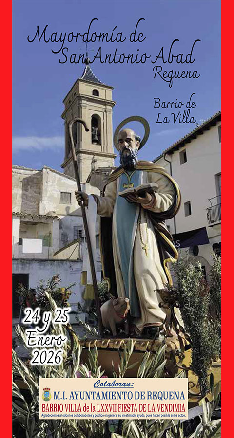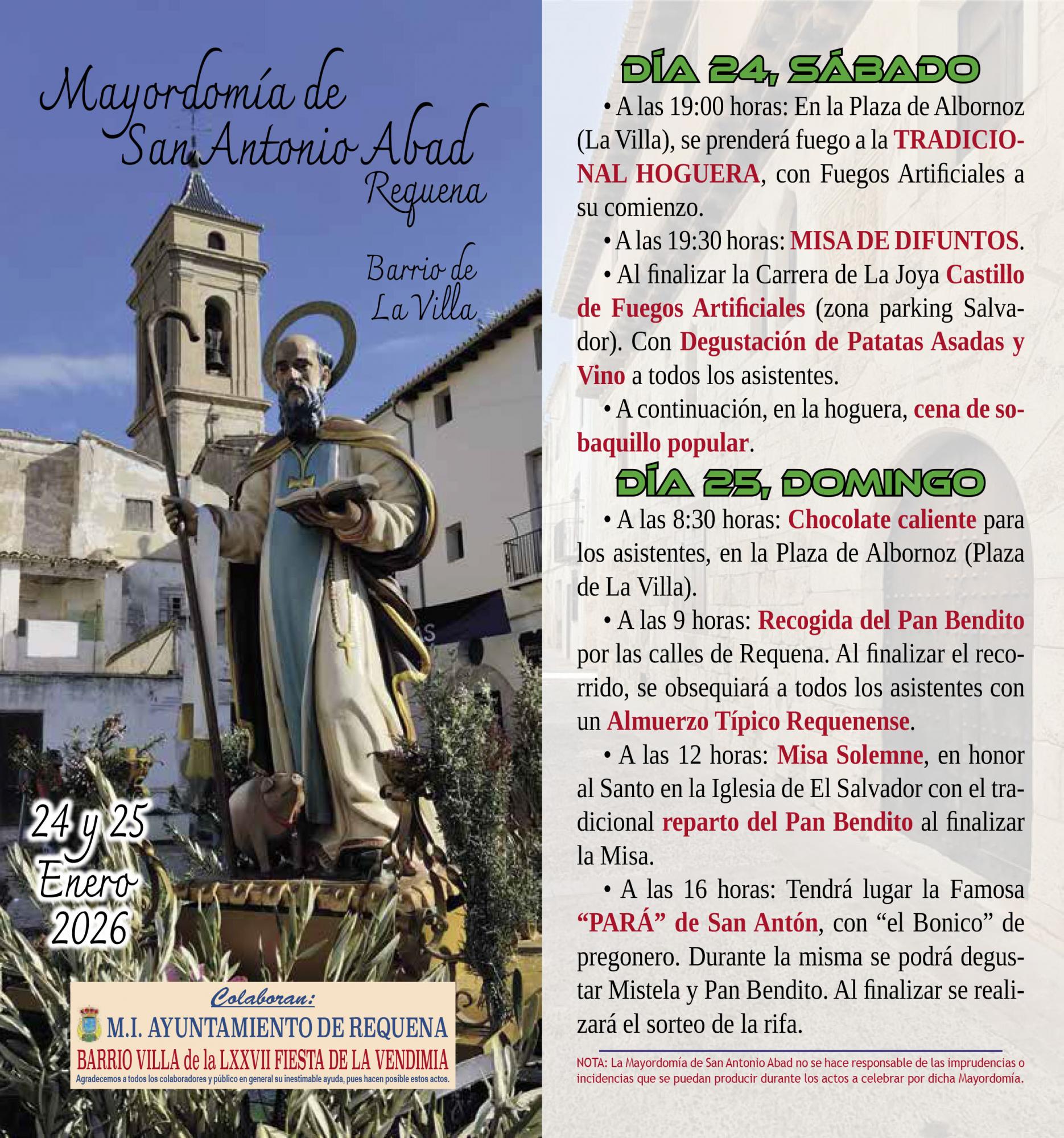 La Mayordomía de San Antonio Abad de los pobres, en Requena, realizará éste fin de semana en la Plaza Albornoz del barrio Villa, los actos festejos en honor al Santo .