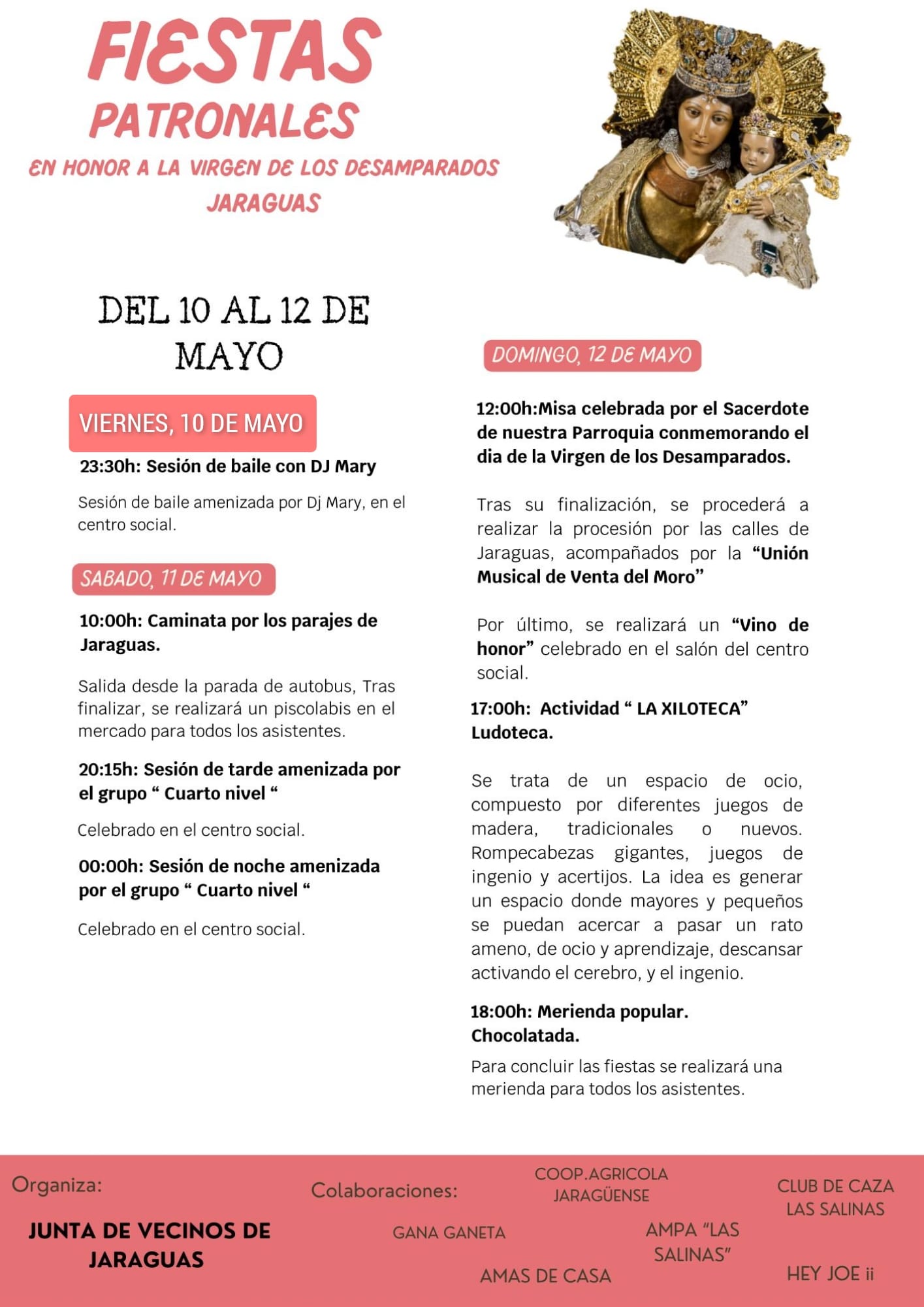 Tras más de 15 años, os anunciamos el regreso de las Fiestas de Mayo de Jaraguas en honor a la Virgen de los Desamparados, celebradas tradicionalmente el segundo domingo de Mayo.