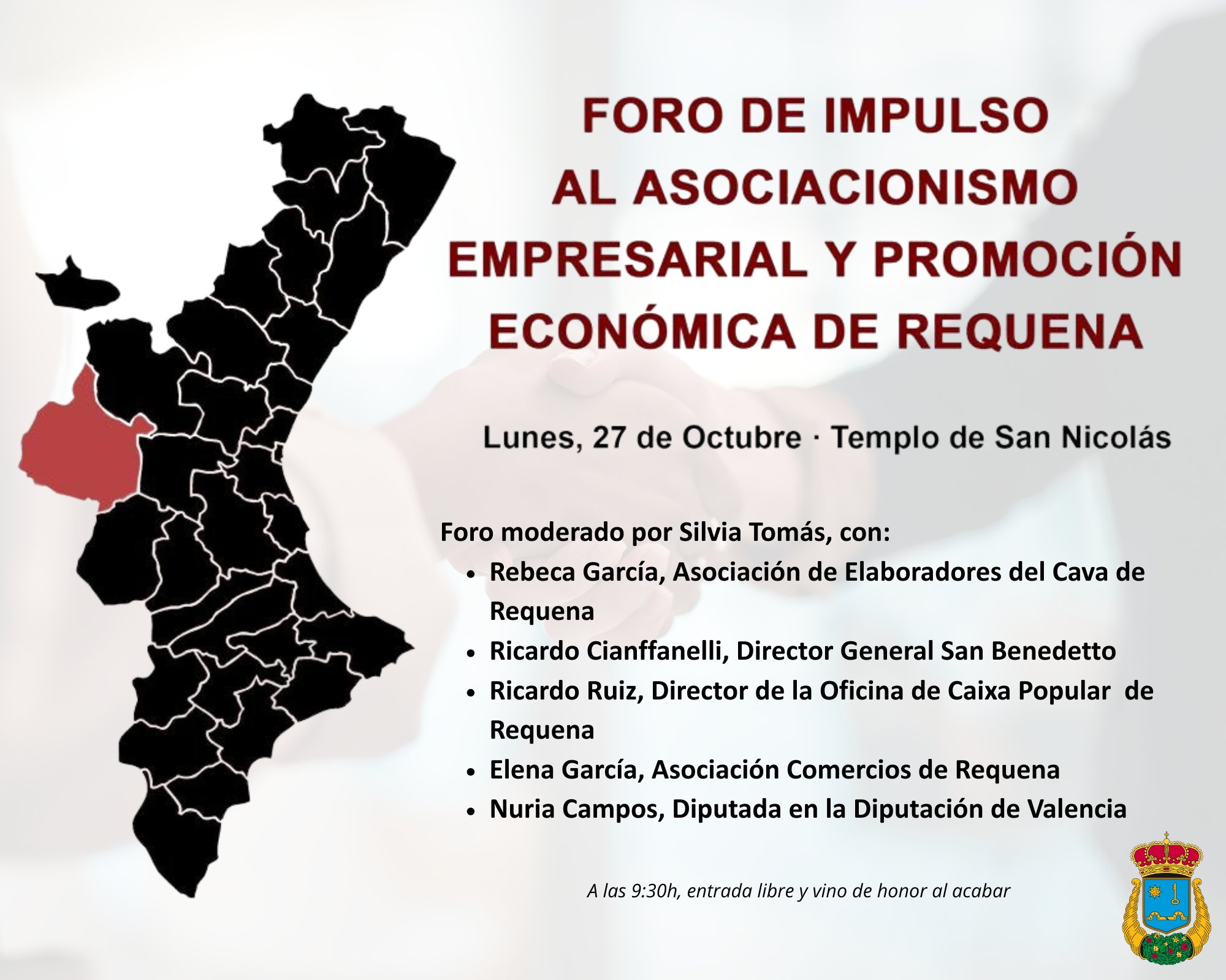 Desde el Ayuntamiento de Requena informan de que el próximo lunes, 27 de octubre, se celebrará en el Templo de San Nicolás el Foro de Impulso al Asociacionismo Empresarial y Promoción Económica de Requena.