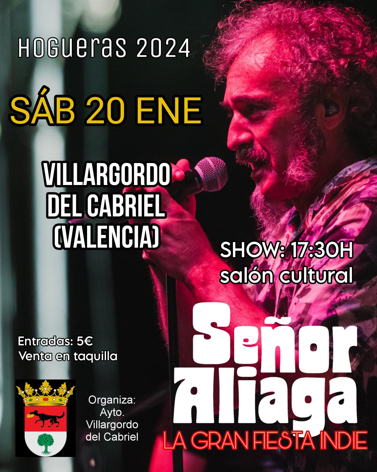 - A las 17:30h tendrá lugar en el Salón Cultural el esperado concierto de Señor Aliaga. Entrada: 5€. Organiza Ayto. de Villargordo del Cabriel.