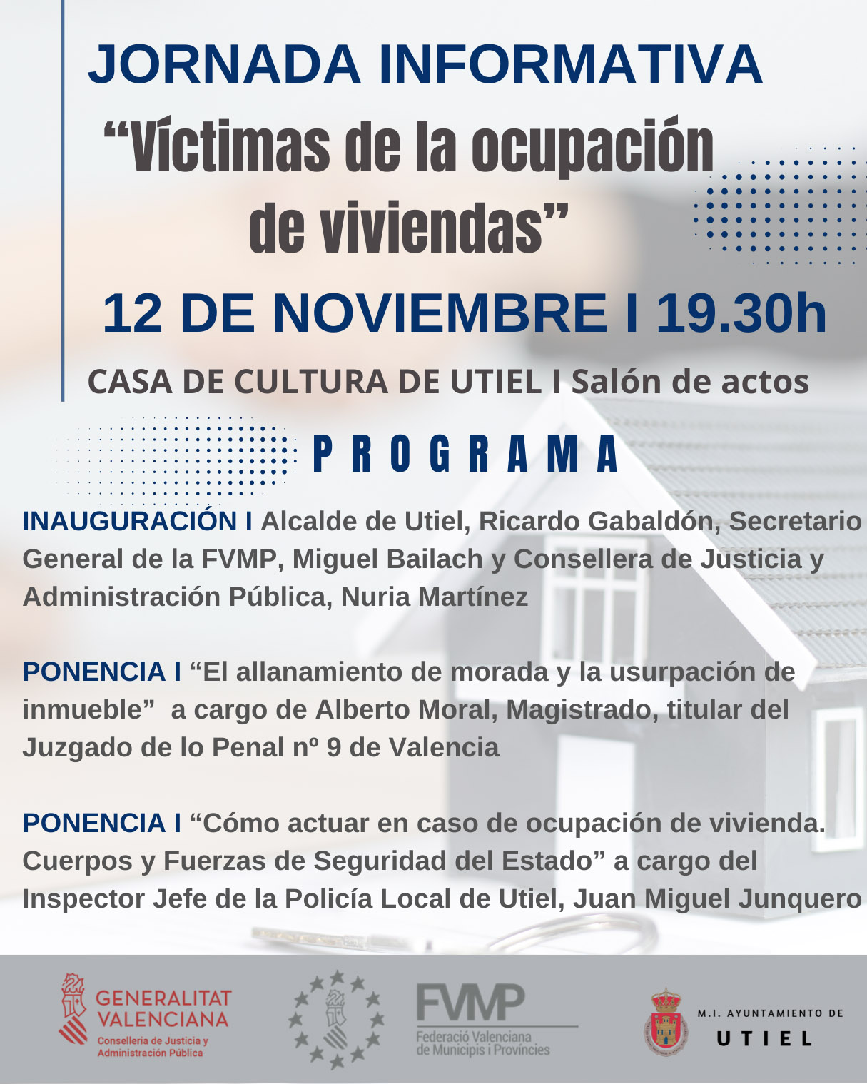 El Ayuntamiento de Utiel junto con la Conselleria de Justicia y Administración Pública y la Federación Valenciana de Municipios y Provincias (FVMP) organizan la jornada informativa «Víctimas de la ocupación de viviendas»