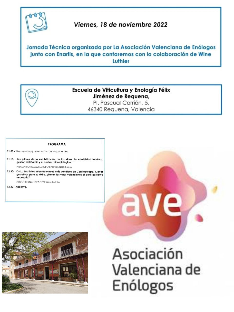 La Asociación Valenciana de Enólogos, junto con Enartis, ha organizado una jornada técnica para todos sus asociados/as el día 18 de noviembre a las 11 horas en la Escuela de Viticultura y Enología de Requena.