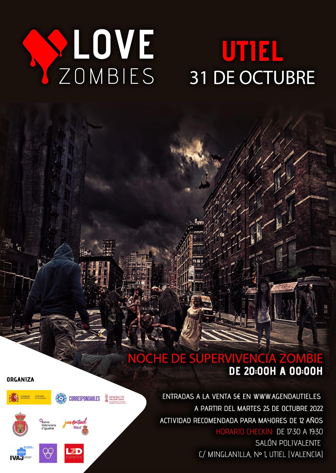 Love Zombies se celebrará de 20 a 00 horas por todas las calles de Utiel , realizándose el check-in de inscritos en el Salón Polivalente de 17.30 a 19.30 horas