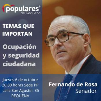 El senador Fernando de Rosa ofrecerá este jueves 6 de octubre a las 20.30 horas en la sede del Partido Popular de Requena una charla sobre Ocupación y seguridad ciudadana, abierta a todo aquel que desee asisitir. La ocupación y la seguridad ciudadana es un tema que preocupa en nuestra sociedad y está de máxima actualidad, por ello que será la primera de las charlas que se realizarán durante el curso político en el ciclo de charlas que inicia el Partido Popular de Requena en su sede bajo el nombre “Temas que interesan”.