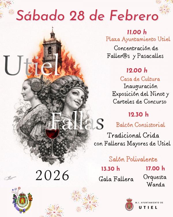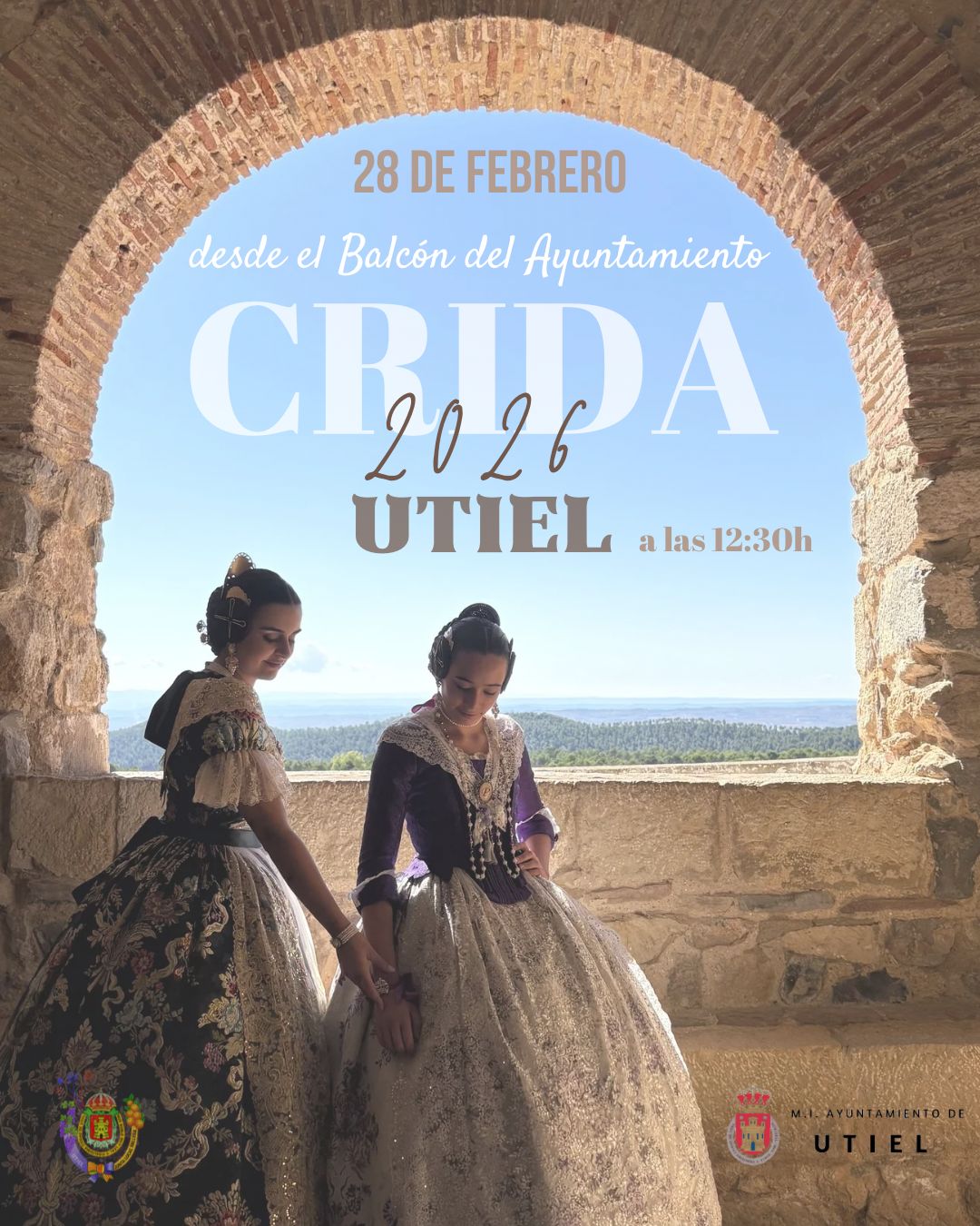 - 12:30 horas: Tradicional «Crida» desde el Balcón Consistorial a cargo de la Falleras Mayor e Infantil de Utiel, Celia Moya Latorre y Paula Clemente Pérez, con el que se marcará oficialmente el inicio de las Fallas de Utiel 2026