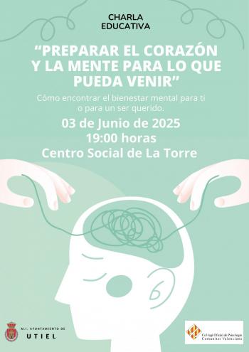 El martes , 3 de junio a las 19:00 horas, el Centro Social de La Torre de Utiel acogerá la charla «Preparar el corazón y la mente para lo que pueda venir. ” organizada a través del área de psicología de departamento de Servicios Sociales del Ayuntamiento de Utiel en colaboración con el Colegio Oficial de Psicología de la Comunidad Valenciana.