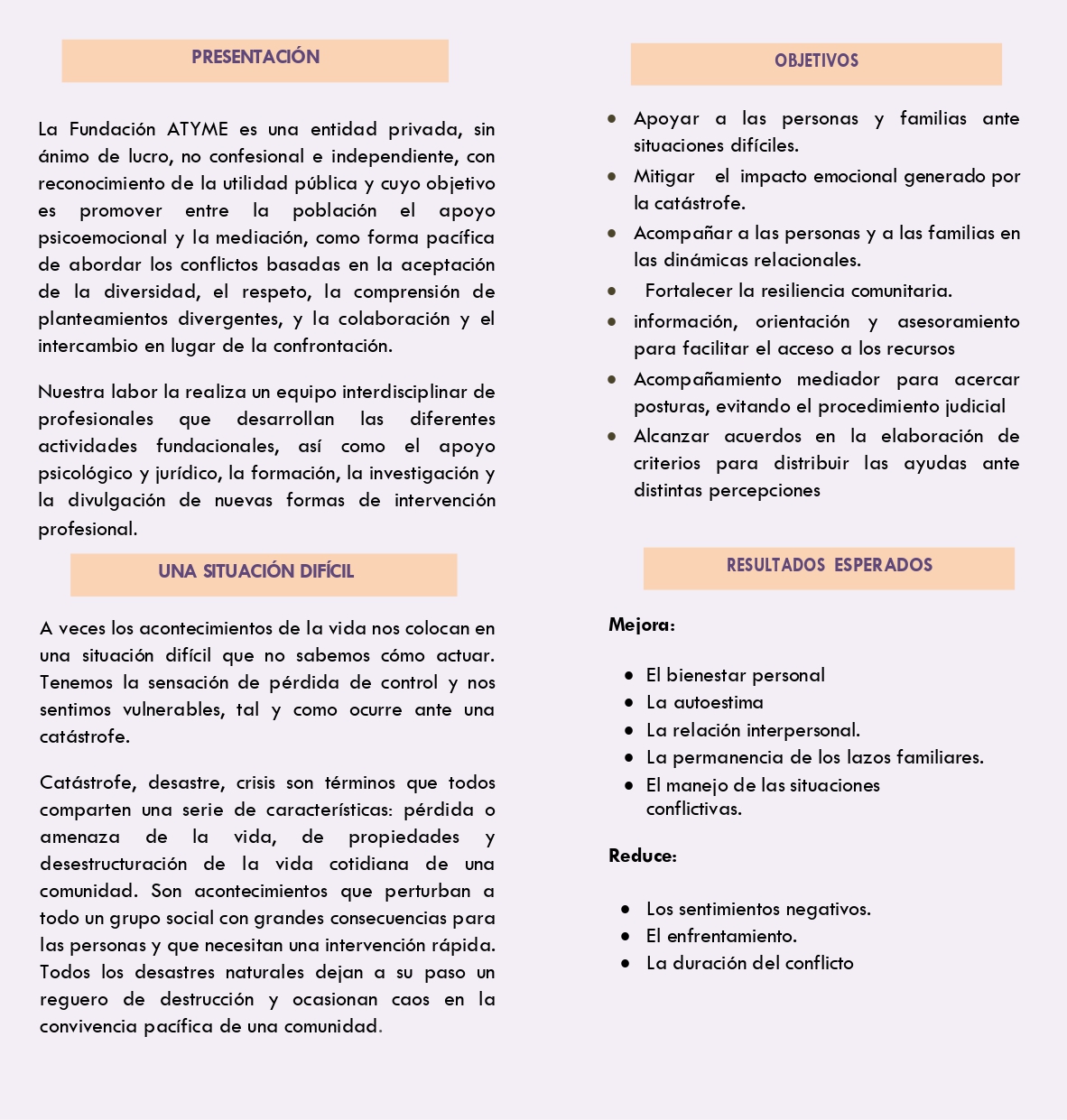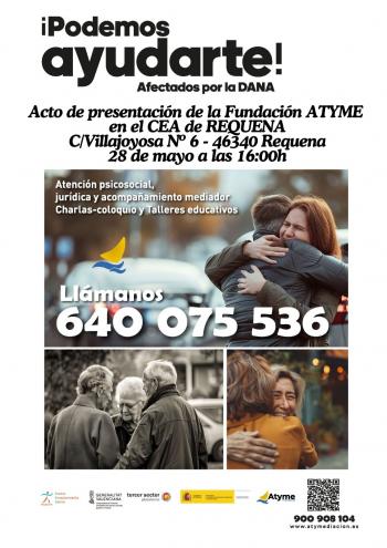 El próximo miércoles, 28 de mayo, a las 16 h, la Fundación ATYME presentará en el Centro de Envejecimiento Activo de Requena (Calle Villajoyosa, nº6) el programa de charlas, coloquios y talleres que se van a realizar en los próximos meses en diferentes zonas afectadas por la dana.