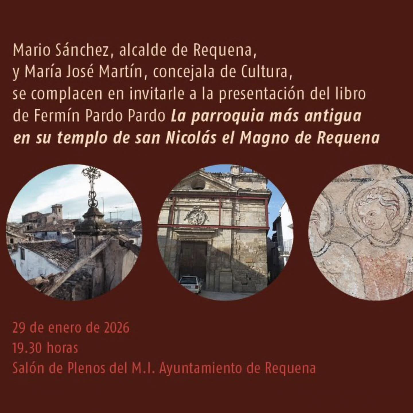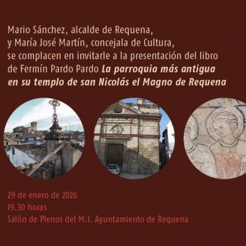El próximo jueves 29 de enero, a las 19:30h, en el Salón de Plenos del M.I. Ayuntamiento de Requena, se presentará el libro «La parroquia más antigua en su templo de san Nicolás el Magno de Requena» , por su autor, D. Fermín Pardo Pardo