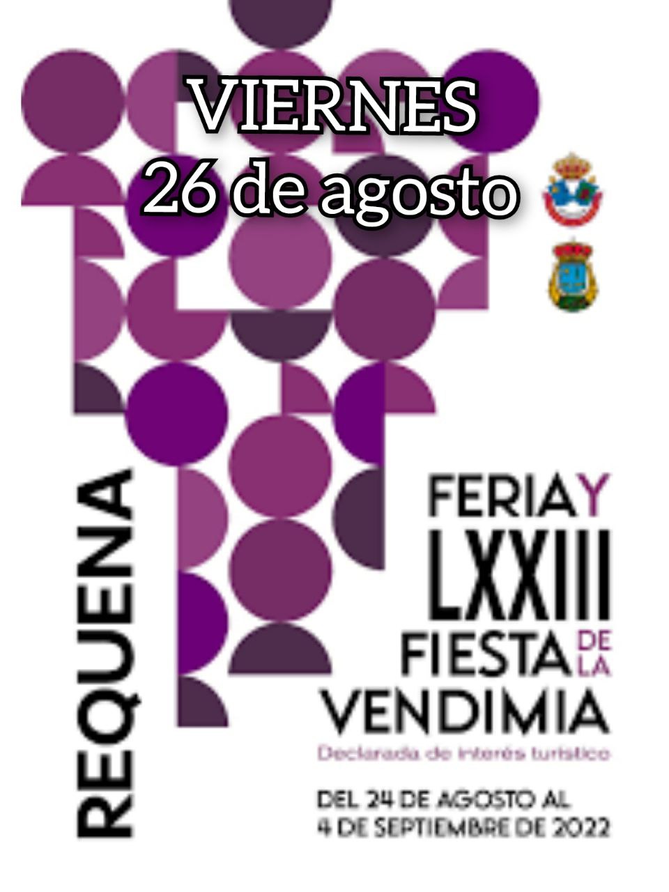 19.30 h:INAUGURACIÓN DEL XXIII MERCADO MEDIEVAL por parte de autoridades y comisiones de la LXXIII Fiesta de la Vendimia. Del 26 al 28 de agosto se realizarán varios pases de exhibiciones. Plaza del Coronel Ruiz de Albornoz. Organiza M.I. Ayuntamiento de Requena.