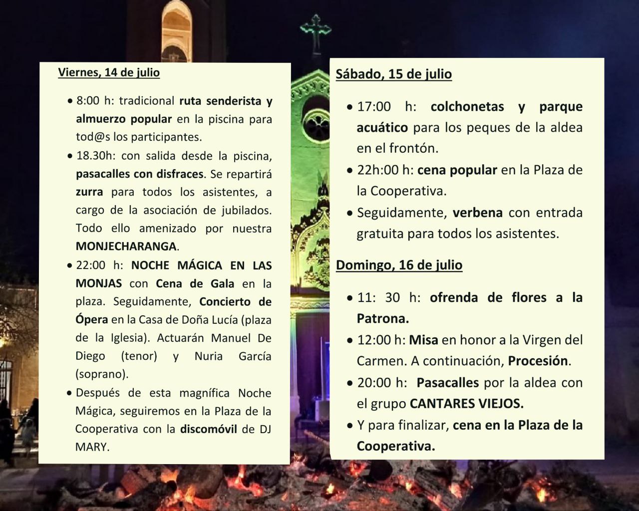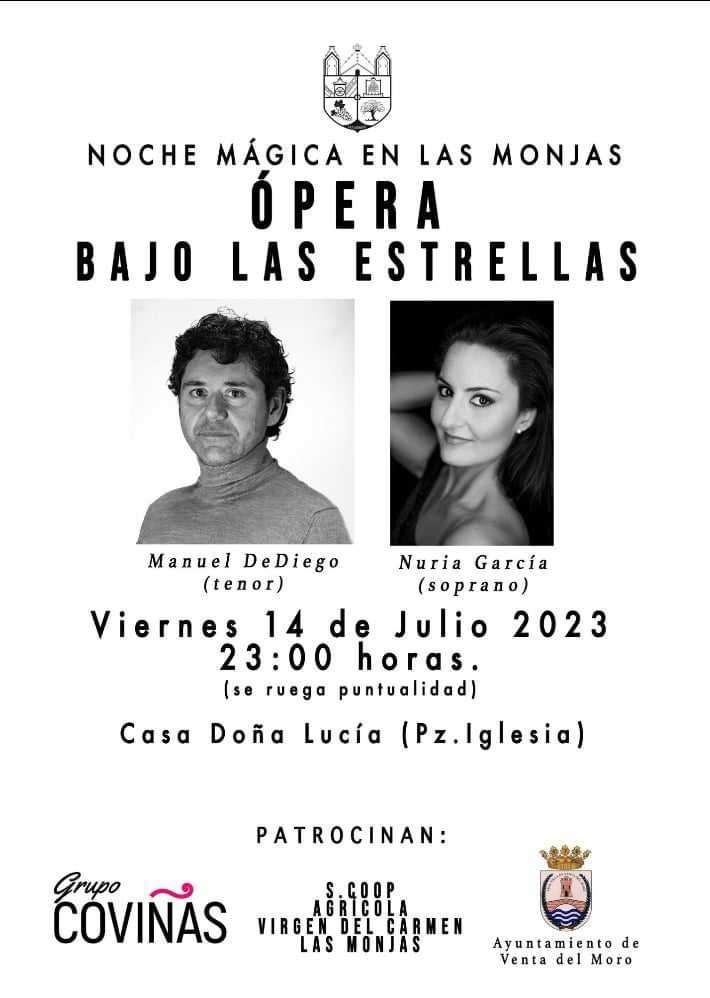 - 22:00 h: NOCHE MÁGICA EN LAS MONJAS con Cena de Gala en la plaza. Seguidamente, Concierto de Ópera en la Casa de Doña Lucía (plaza de la Iglesia). Actuarán Manuel De Diego (tenor) y Nuria García (soprano).