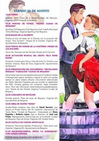 20.30 PRESENTACIÓN DEL DOCUMENTAL “DESVELANDO MIRADAS” FUNDACIÓN “CIUDAD DE REQUENA”. Documental que narra las expediciones que la Fundación realiza a Senegal para operar cataratas y mejorar la visión con ayudas ópticas en plena sabana africana. Documental seleccionado por Radio Televisión Española para ser emitido en septiembre de 2023. Entrada gratuita con invitación, hasta completar aforo. Para más información www.fundacionciudadderequena.com. Templo de San Nicolás. Organiza Fundación Ciudad de Requena.