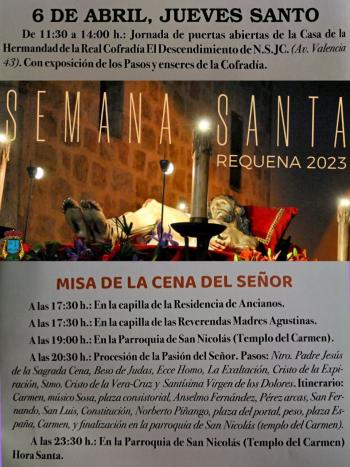 - De 11:30 a 14:00 h: Jornada de puertas abiertas de la Casa de la Hermandad de la Real Cofradía El Descendimiento de N.S.JC. (av. Valencia, 43) con exposición de los Pasos y enseres de la Cofradía.