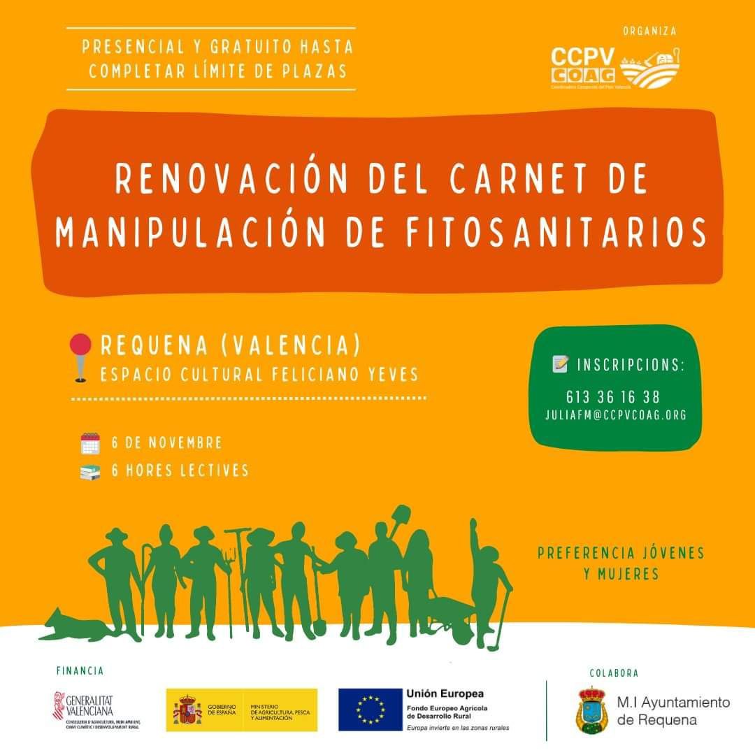 Curso de renovación del carnet de manipulación de fitosanitarios organizado por CCPV-COAG, financiado por la Diputació de València, el Ministerio de Agricultura, Pesca y Alimentación de España y la UE, con la colaboración del M.I Ayuntamiento de Requena.