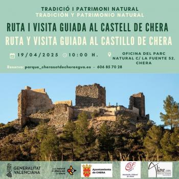 Estas pascuas en el Parque Natural de Chera-Sot de Chera hemos programado una ruta guiada por el sendero local del agua de Chera, en el que hablaremos de la flora y fauna de la zona, su singular geología y tradiciones, y acabaremos en el recién restaurado Castillo de Chera. Esta actividad se realiza en colaboración con el Ayuntamiento de Chera, y el estudio de Arqueología y gestión del patrimonio ALIZAZ COOP.V, que nos contarán la historia y las curiosidades de los descubrimientos encontrados en la reciente restauración del Castillo de Chera.