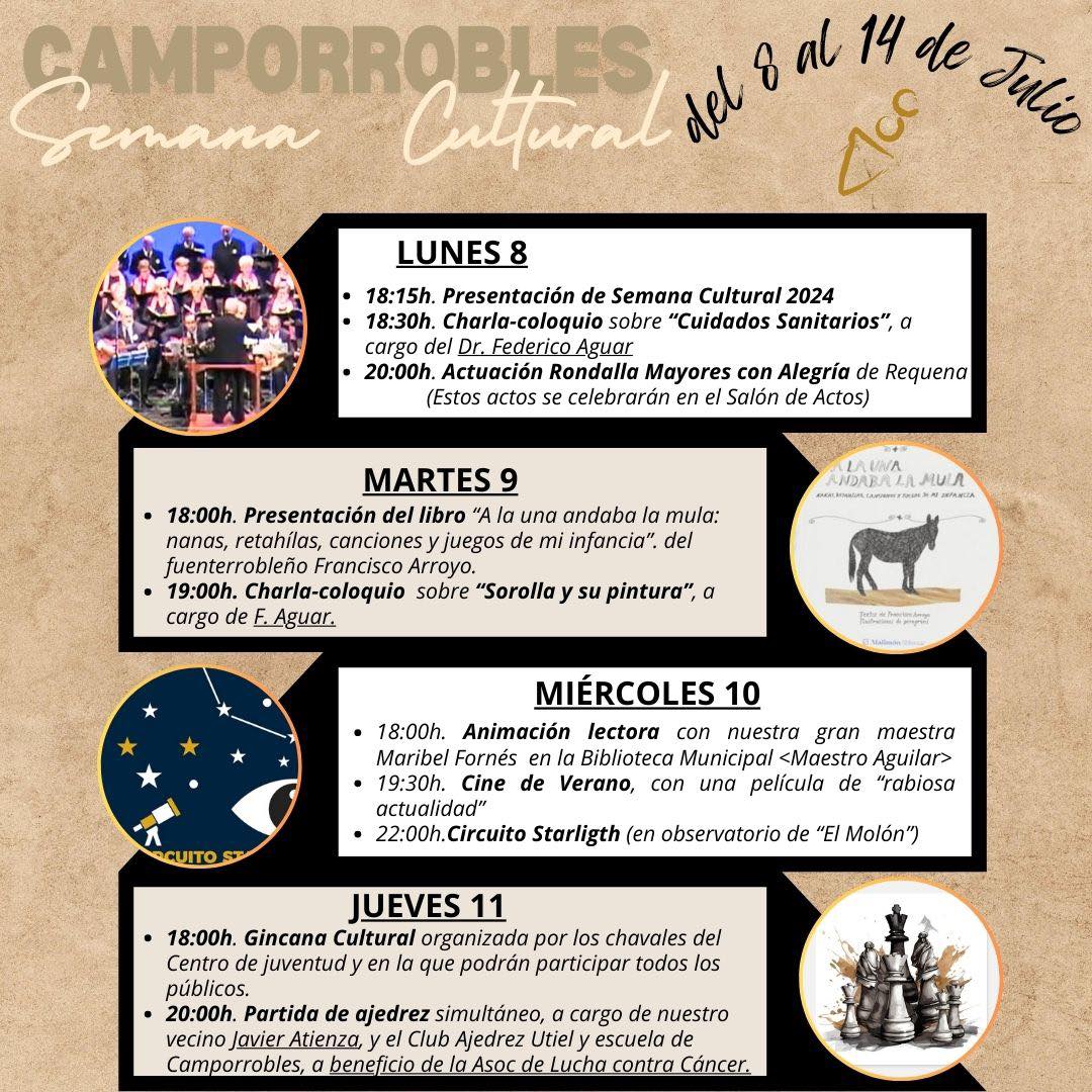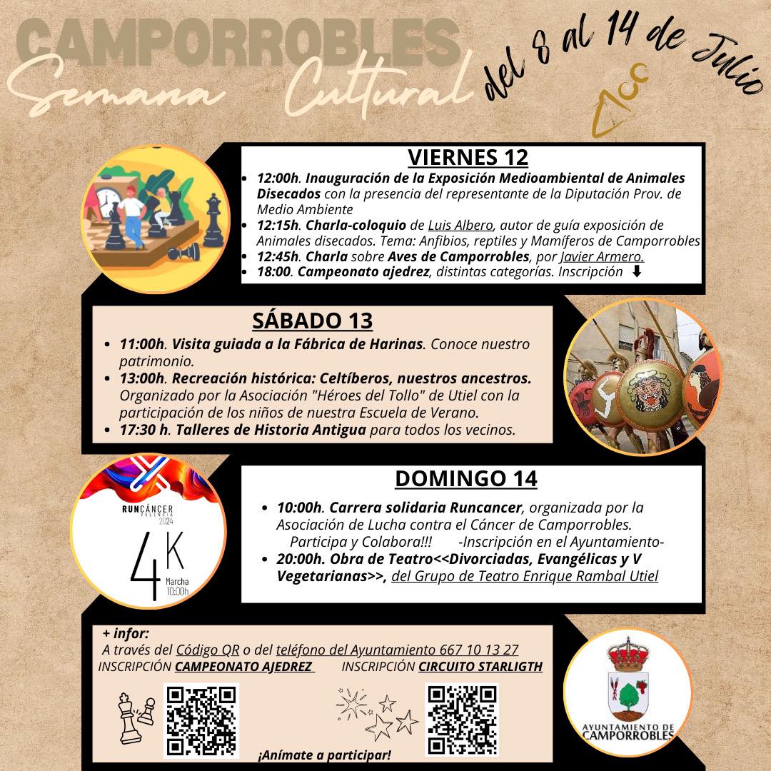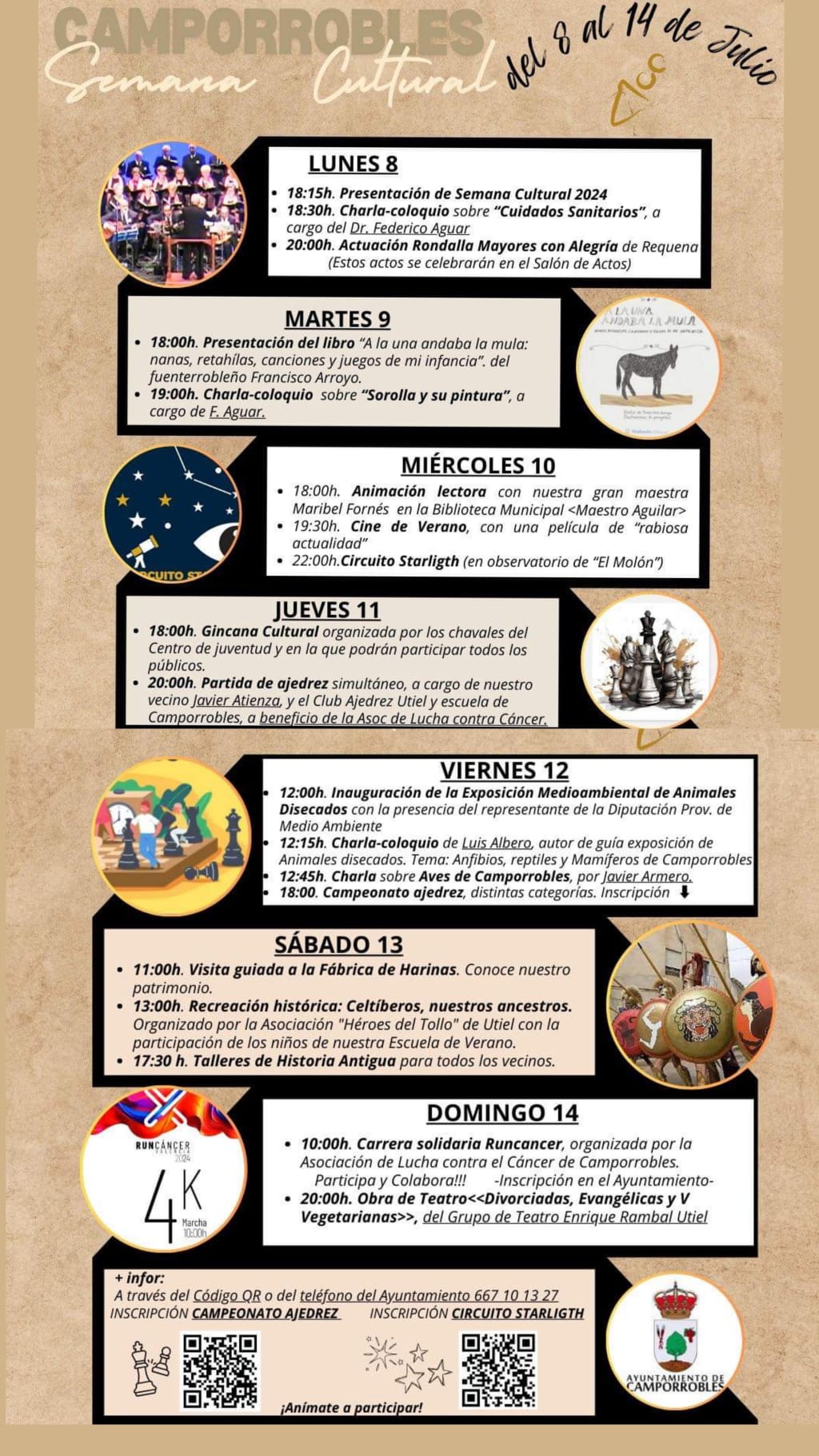 Con el objetivo de ofrecer a vecinos y visitantes el acceso a la cultura y el entretenimiento gratuitamente durante la época estival, la concejalía de Cultura del ayuntamiento de Camporrobles ha programado unas actividades variadas donde tengan cabida y participen personas de distintas edades, de distintas culturas y de distinto género.