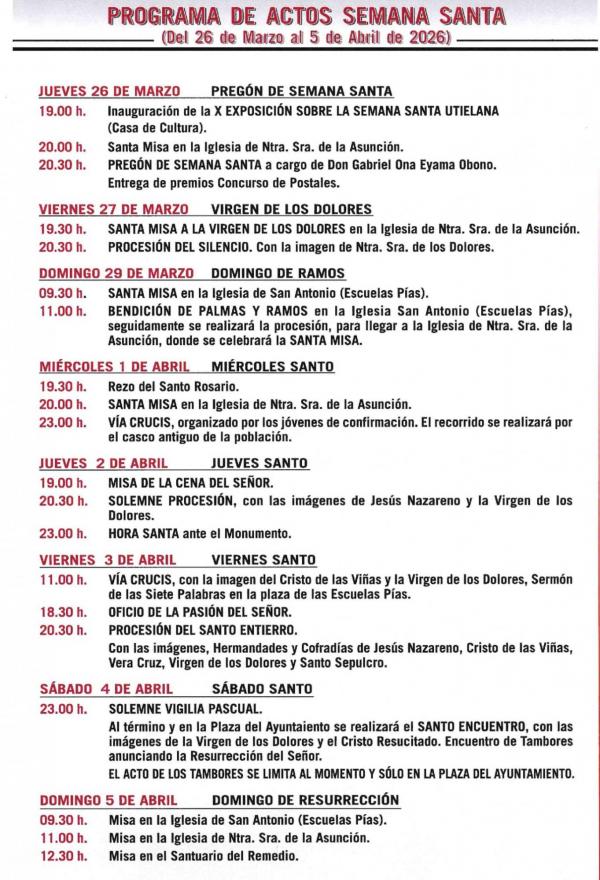 La Junta de Hermandades de Semana Santa de Utiel organiza el tradicional programa de Semana Santa con procesiones de pasos y cofradías con arraigo en el municipio.