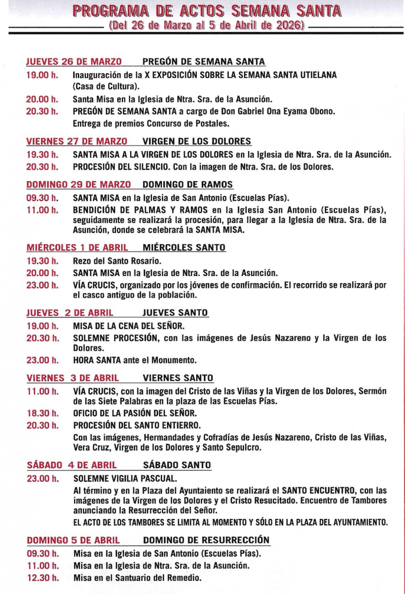 PROGRAMA DE ACTOS SEMANA SANTA – Del 26 de marzo al 5 de abril de 2026