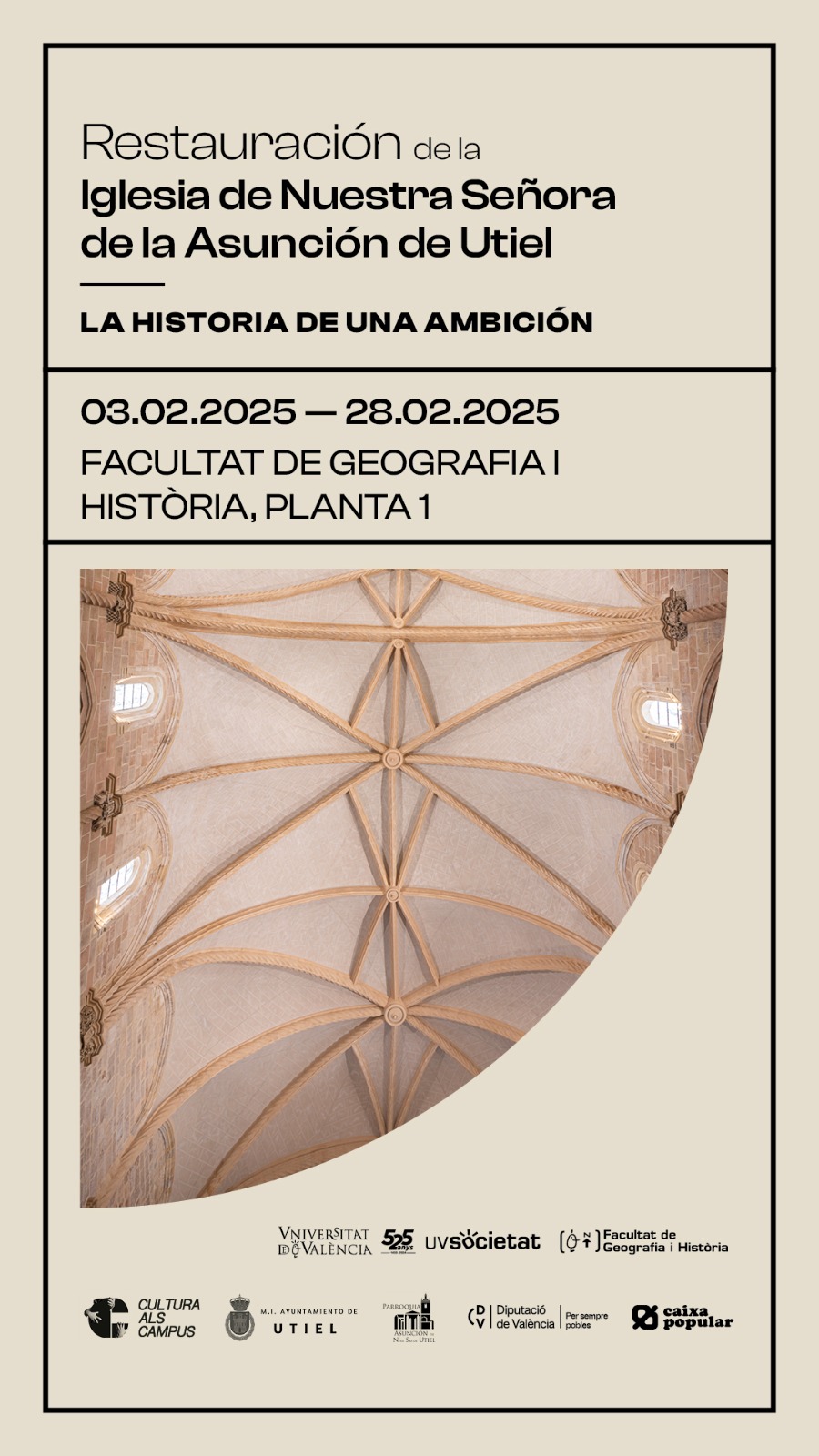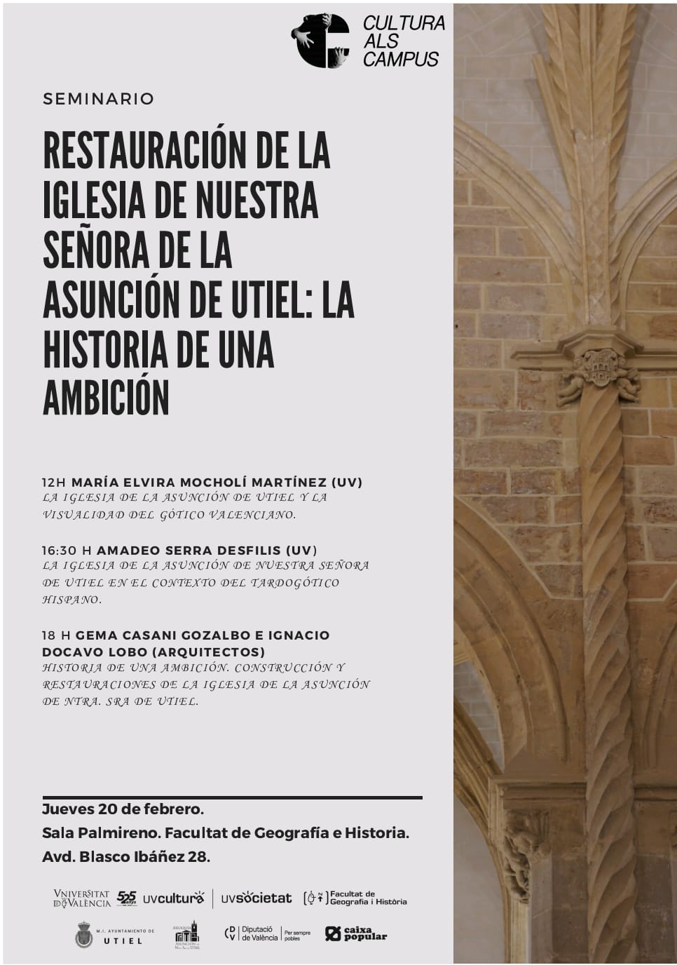 El próximo jueves 20 de febrero se celebrará, en la Sala Palmireno de la Facultad de Geografía e Historia, el seminario: ‘Restauración de la Iglesia de Nuestra Señora de la Asunción de Utiel: la historia de una ambición’.
