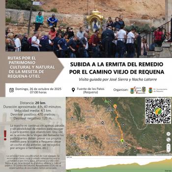 Aprovechando la tradicional subida de la Virgen del Remedio a su ermita el último domingo de octubre, andaremos el camino tradicional que desde Requena se hace hasta la ermita llamado camino de Rozaleme y carril de Cabañas al pie de la Sierra de Juan Navarro. Una caminata que nos permite admirar el paisaje otoñal meseteño y el de montaña atravesando ramblas con elementos patrimoniales como la propia ermita, molinos, casillas de campo, hormas de buena magnitud, etc.