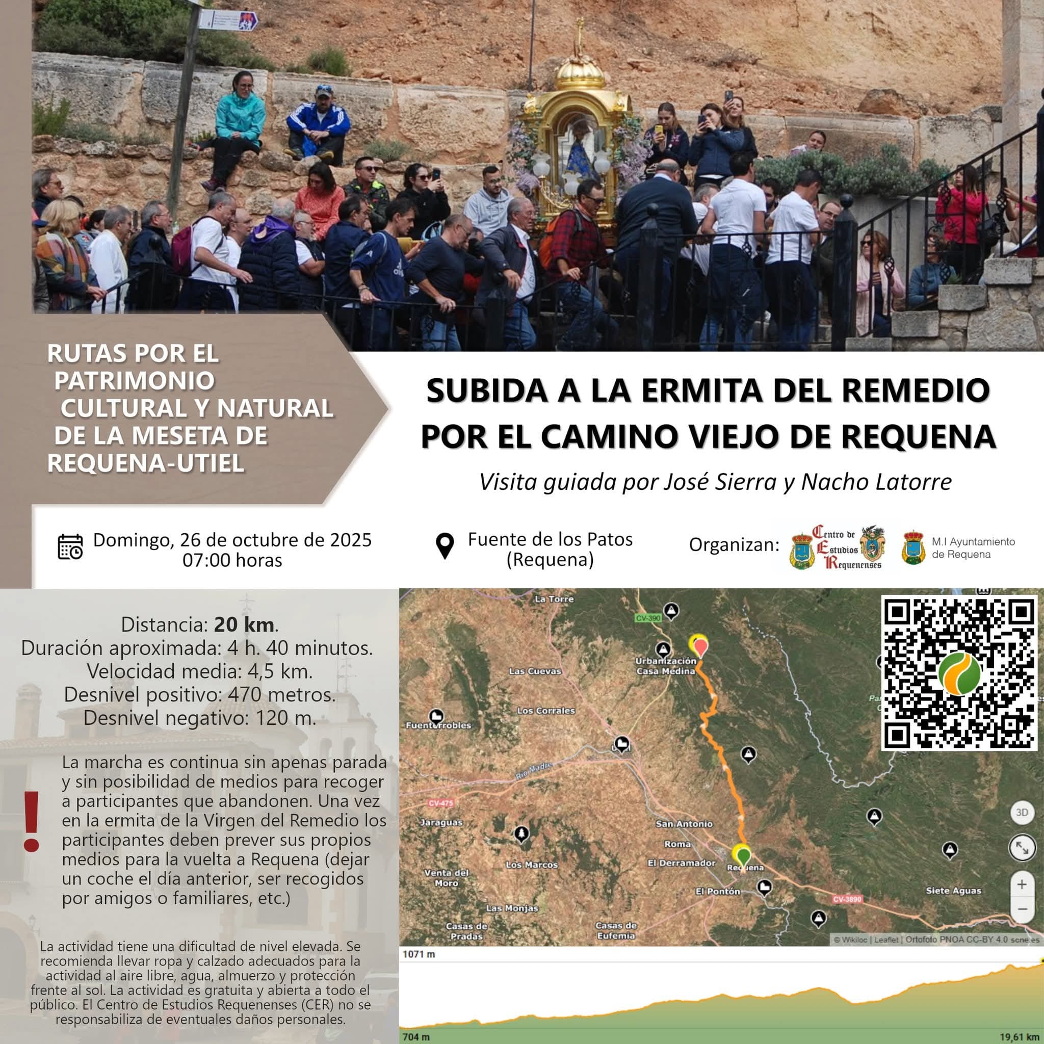 La ruta tiene una distancia de 20km, que se realizará sin apenas paradas y sin posibilidad de medios para recoger a los participantes que abandonen. Una vez en la ermita, los participantes deben prever sus propios medios para la vuelta a Requena (dejar un coche el día anterior, ser recogido por amigos o familiares, etc.)