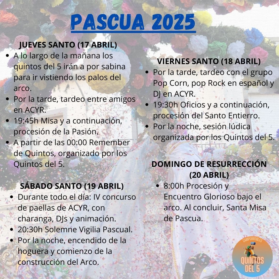 Los Quintos son los responsables de organizar las procesiones de Semana Santa, y muy especialmente de construir, la noche previa al Domingo de Pascua, una enramada en forma de templete: el Arco.