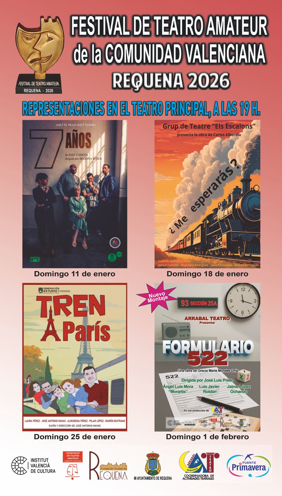 La Coordinadora de Actividades Teatrales ARRABAL-TEATRO, en colaboración con la Federación de Teatro Amateur de la Comunidad Valenciana y la Fundación “Ciudad de Requena” y con el patrocinio del M. I. Ayuntamiento de Requena, organiza el FESTIVAL DE TEATRO AMATEUR DE LA COMUNIDAD VALENCIANA – REQUENA 2026