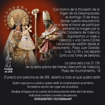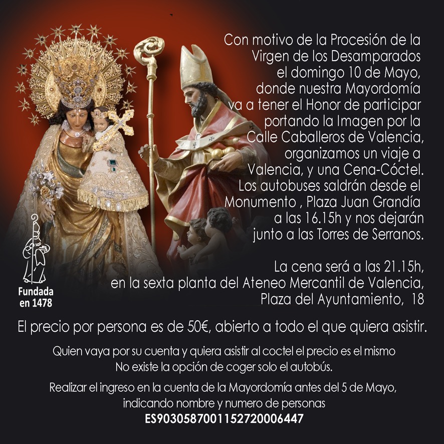La Mayordomía de San Nicolás de Bari de Requena ha organizado un viaje a Valencia con motivo de la tradicional Procesión de la Virgen de los Desamparados, que se celebrará el domingo 10 de mayo. En esta ocasión, la Mayordomía tendrá el honor de participar en el acto portando la imagen por la calle Caballeros.