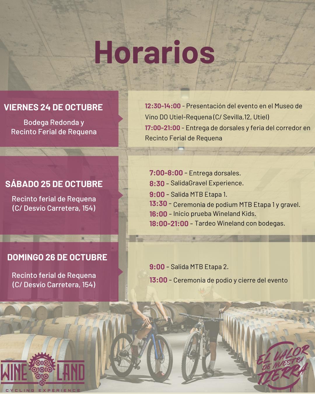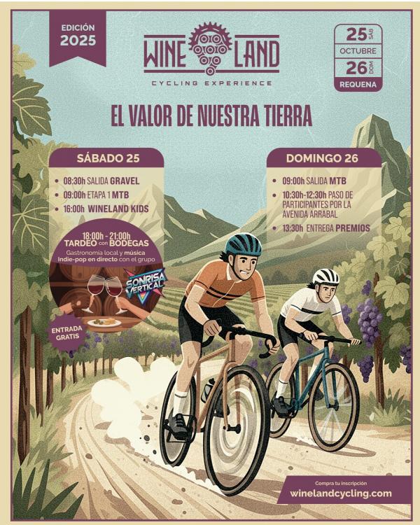 Wineland se compone de 2 modalidades. MTB compuesta por dos etapas, sábado y domingo. Y la modalidad Gravel que discurre por 120kms de caminos entre viñedos de toda la comarca, con una particularidad que la hace única, el paso de la prueba por dentro de las bodegas patrocinadoras. Además el plan se completa con actividades para toda la familia, una prueba para niños y un tardeo con gastronomía local.