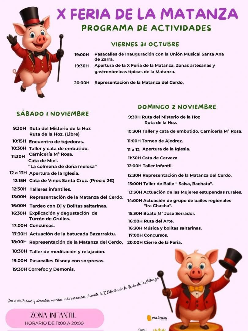Zarra se convertirá en el epicentro festivo del Valle de Ayora-Cofrentes. El municipio ultima los preparativos para acoger la X Feria de la Matanza, una cita que se celebrará del 31 de octubre al 2 de noviembre y que promete reunir a numerosos visitantes en torno a la tradición, la cultura popular y la gastronomía de interior.