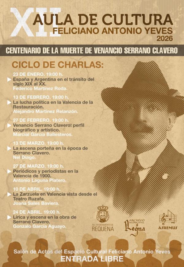 Este próximo viernes 23 de enero, a las 19 h, se iniciará la duodécima Aula de Cultura Feliciano Antonio Yeves que este año estará íntegramente dedicada al escritor requenense Venancio Serrano Clavero en el centenario de su defunción.