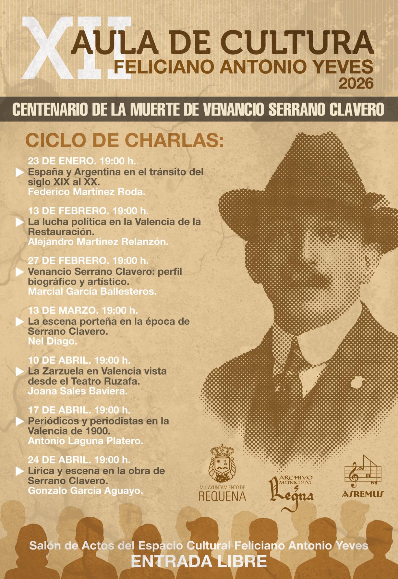 Este próximo viernes 17 de abril a las 7 de la tarde, dentro del ciclo de charlas de la duodécima Aula de Cultura Feliciano Antonio Yeves que este año está íntegramente dedicada al escritor requenense Venancio Serrano Clavero y su época en el centenario de su defunción, tendrá lugar la charla Periódicos y periodistas en la Valencia de 1900 por Antonio Laguna Platero.
