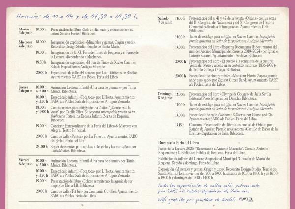 - Paseo de la Lectura 2025: “Recordando a Antonio Machado”. Círculo Artístico Requenense y la Biblioteca Pública de Requena. Feria del Libro.