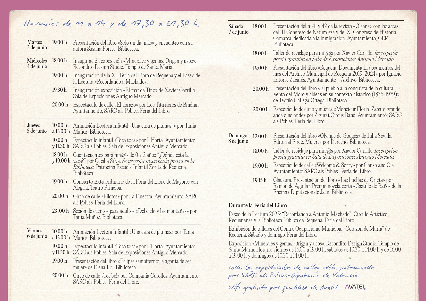 - 19 h. Inauguración de la XL Feria del Libro de Requena y el Paseo de la Lectura «Recordando a Machado».