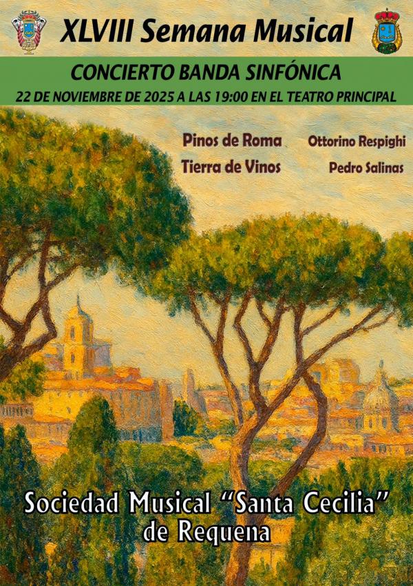 La Semana Musical, organizada por la Sociedad Musical «Santa Cecilia» de Requena en colaboración con el M.I. Ayuntamiento de Requena, finaliza este sábado con el concierto de clausura. La banda sinfónica, bajo la batuta de Enrique Sapiña, actuará en el Teatro Principal el sábado 22 de noviembre a las 19.00 horas. La banda de Requena interpretará «Pinos de Roma» de Ottorino Respigui y la Sinfonía n°1 «Tierra de Vinos» del compositor requenense Pedro Salinas.