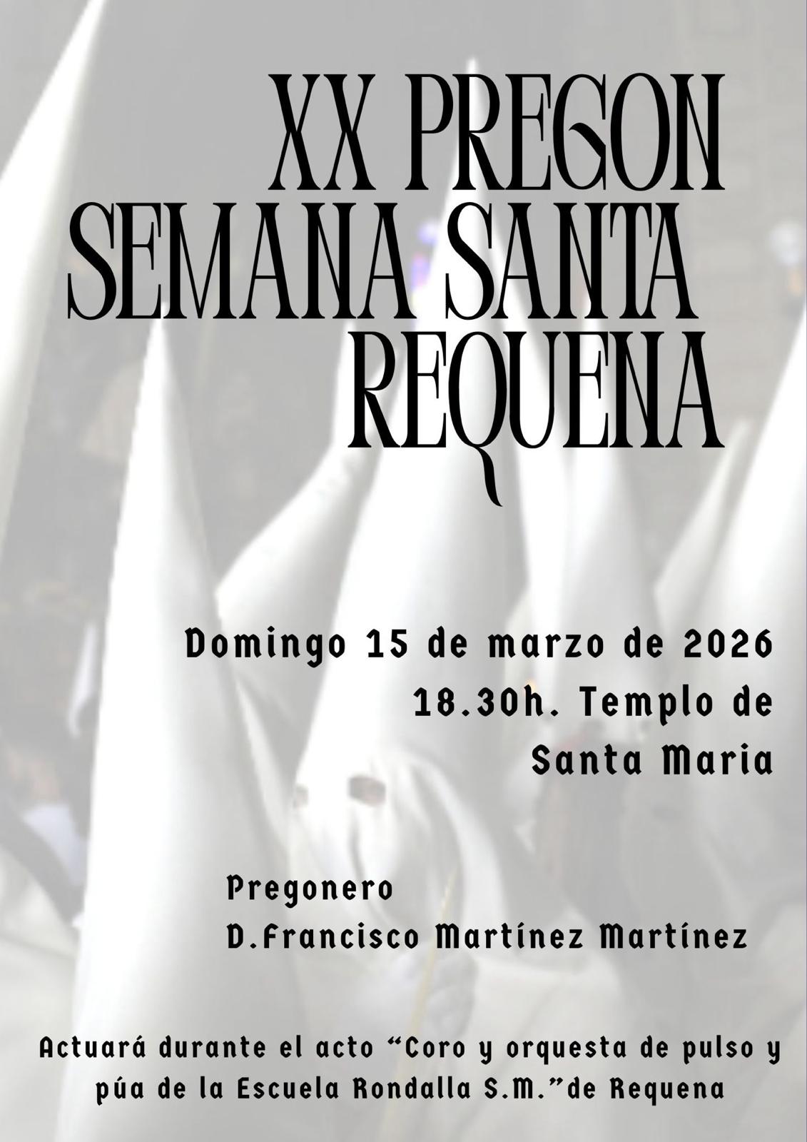 D. Francisco Martínez Martínez será el Pregonero de la Semana Santa requenense el próximo domingo 15 de marzo, a las 18.30 h., en el Templo de Santa María.