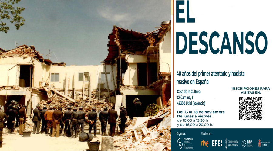 Ayuntamiento de Utiel, Federación Valenciana de Municipios y Provincias, Consellería de Justicia y Administraciones Públicas de la Generalitat Valenciana y Fundación Víctimas del Terrorismo, con la colaboración de la Agencia EFE y RTVE, exponen en la Casa de la Cultura de Utiel -C/ Camino, 1- una muestra In Memoriam por las 18 personas asesinadas, y 84 heridas, en el cuarenta aniversario del primer atentado de corte islamista en España, ocurrido en Madrid, el 12 de abril de 1985 contra el restaurante El Descanso, ubicado en el kilómetro 14,200 de la A2. Permanecerá abierta al público del 12 al 28 de noviembre, de lunes a viernes.