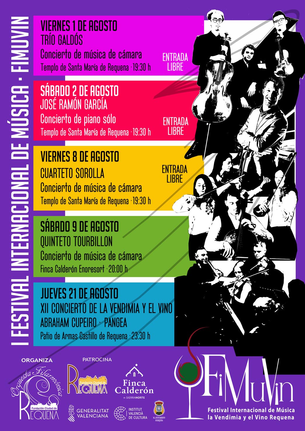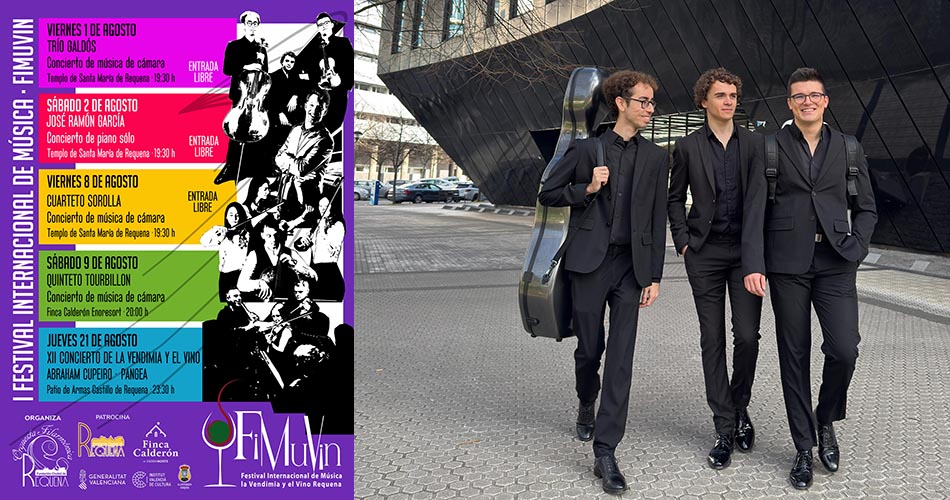 La Orquesta Filarmónica Fundación Ciudad de Requena arranca la programación del Festival Internacional de Música la Vendimia y el Vino (FiMuVin) con el Trío Galdós y el pianista albaceteño José Ramón García, el viernes 1 de agosto y el sábado 2, respectivamente, en el Templo de Santa María de Requena a las 19.30h, con entrada libre y gratuita hasta completar el aforo. El acontecimiento cultural, patrocinado por la Fundación Ciudad de Requena y Bodega Raíces Ibéricas, acogerá un total de cinco conciertos en diferentes espacios del 1 al 21 de agosto y se enmarca dentro de los actos programados de la Feria y Fiesta de la Vendimia de Requena, declarada de Interés Turístico.