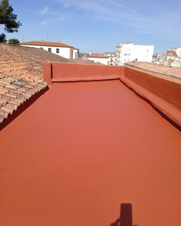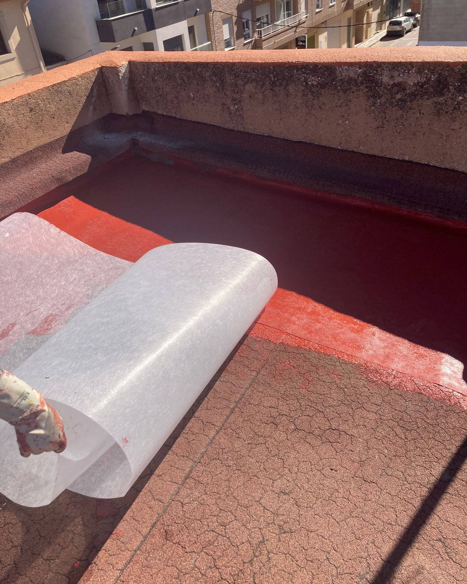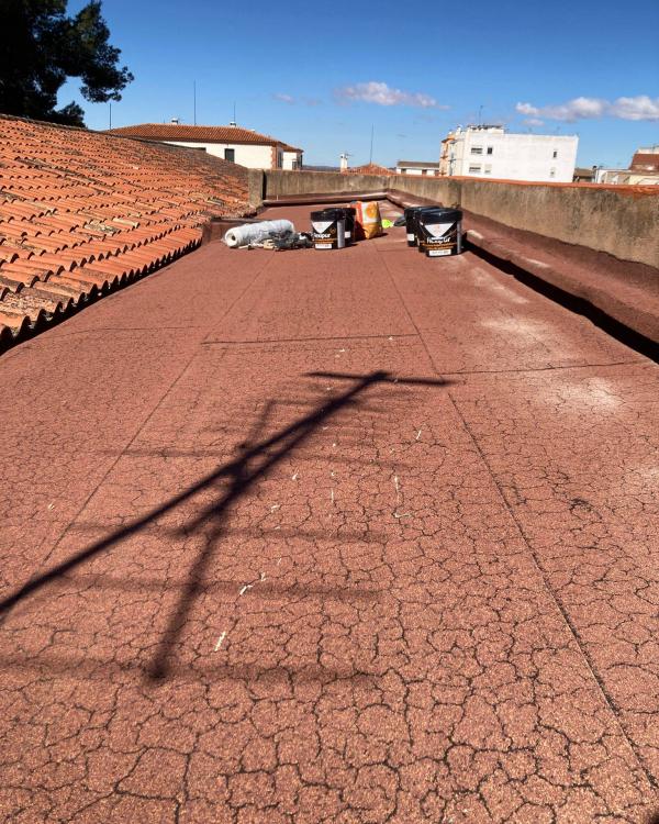 Los trabajos realizados han consistido en la limpieza de la superficie, el sellado con masilla de grietas y juntas, la aplicación de imprimación y fibra de vidrio, así como la posterior aplicación de un producto impermeabilizante para garantizar la correcta protección de la zona intervenida. Además, se ha procedido a la limpieza de las canaleras para favorecer la correcta evacuación del agua de lluvia.