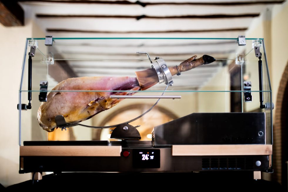 De aquí surgió la idea de una vitrina con control regulado de humedad y temperatura para su óptima conservación, consiguiendo reducir así su oxidación y potenciando al máximo todas las propiedades organolépticas del jamón ibérico. Además de mantener y preservar el jamón en sus óptimas condiciones, la vitrina sirve para exhibir y realzar la pieza culinaria. Un gran invento que se fraguó en nuestras tierras requenenses.