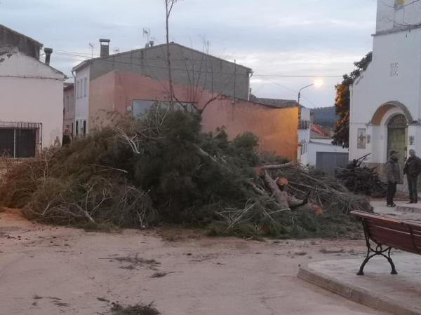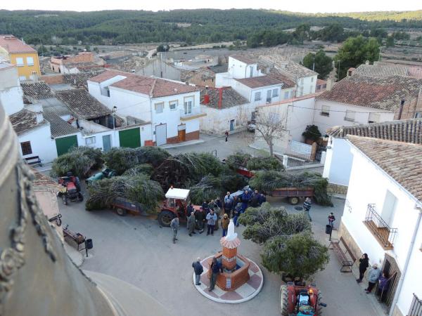 Durante la mañana se afanan en cortar los pinos, desligarlos y subir la madera a los tractores. Almorzados se dirigen a la aldea para formar la hoguera en la plaza de la Iglesia. Previamente, el centro de la plaza se prepara con una capa de arena para que la hoguera no perjudique el asfalto.