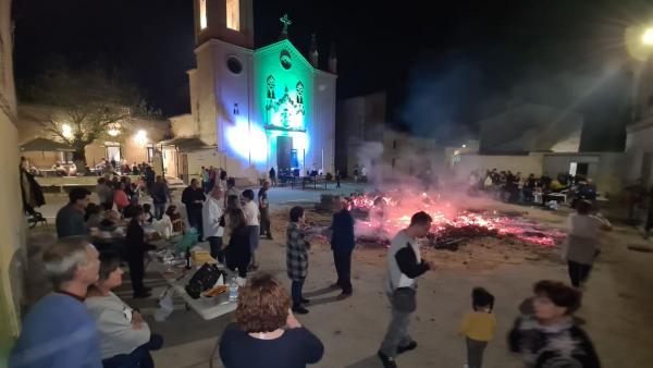 Son los participantes de cada hoguera de barrio o calle los que se encargan de recoger la leña y formar la hoguera, bien la misma mañana o tarde que se le prende fuego. La leña bien puede ser de pino, almendro, olivo o cepas de vides. Hacia las siete u ocho de la tarde se empiezan a prender las hogueras a la par que se prepara el condumio. Son momentos en los que se realiza un aperitivo de encurtidos y productos locales (“perro”, olivas con morquera, productos al aguasal, cortezas, piparras…) El asado se realiza cuando ya se han generado ascuas suficientes que se van apartando un poco de la pira central para poder elaborar el asado. Previamente, se queman las parrillas a llama viva para que no quede ninguna impureza. El asado suele consistir en embutidos locales (güeña, longaniza, morcilla, chorizos); oreja, careta y morro de cerdo y chuletas de cordero. Todo ello regado con vino de bobal y con dulces finales. Se juntan a comer, muchas veces de pie, sin sentarse, el grupo de vecinos, familiares o amigos. Los más aficionados a la pólvora tras la hoguera hacen estallar los morteretes. Hay grupos que convierten este acto en una pequeña “cordá”. Hace algunos años, muchos agricultores hacían una hoguera algo mayor y con mucha pólvora en el solar enfrente del Bar Ventamorino.