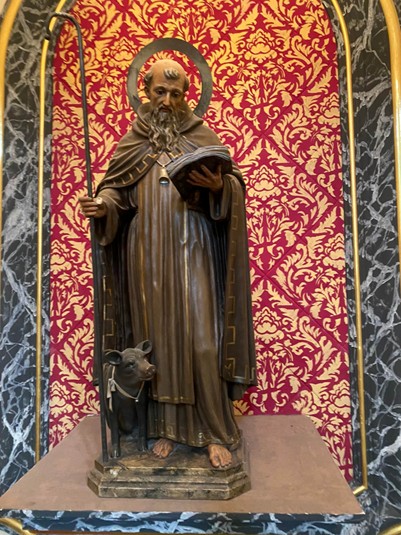 Este cerdo que se ilustra al pie del Santo puede hacer referencia también a la leyenda de que San Antón sanó a una jabalina y sus jabatos de ceguera y desde entonces la madre no se separó del anacoreta.